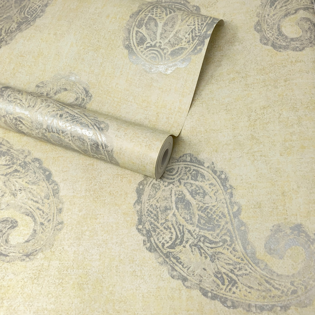 An oatmeal background creates a neutral, textured base for the stunning paisley print wallpaper. Silver metallic inks adorn the boteh motifs, adding a shimmering splendor.