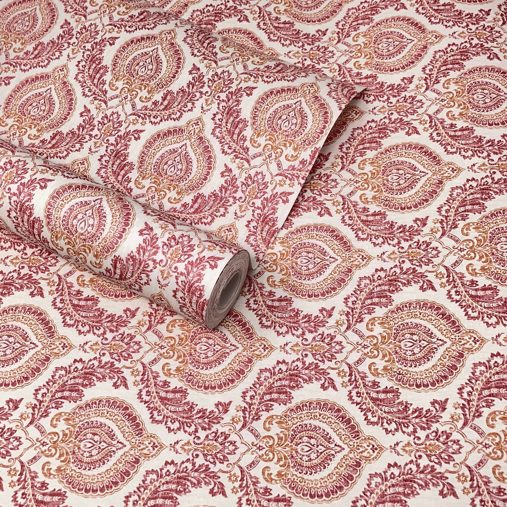 This small scale damask wallpaper comes to life in shades of rose pink and tangerine. Bright yet subdued, these colors are the perfect combination to highlight the intricate details of this design.